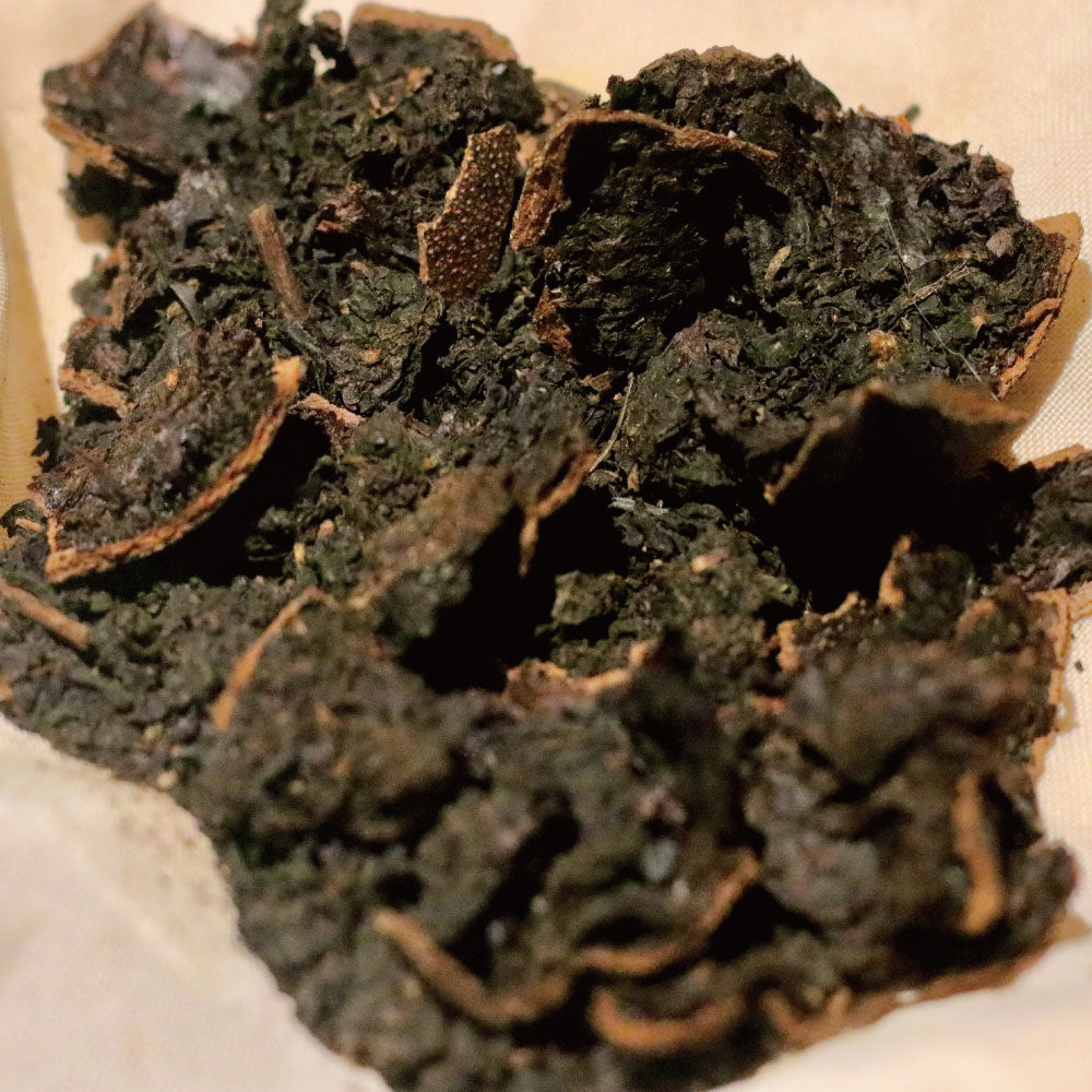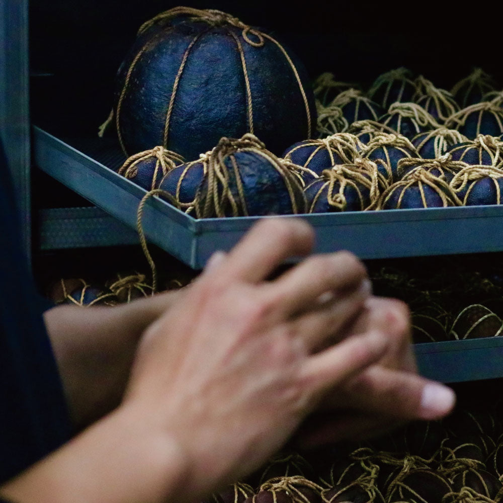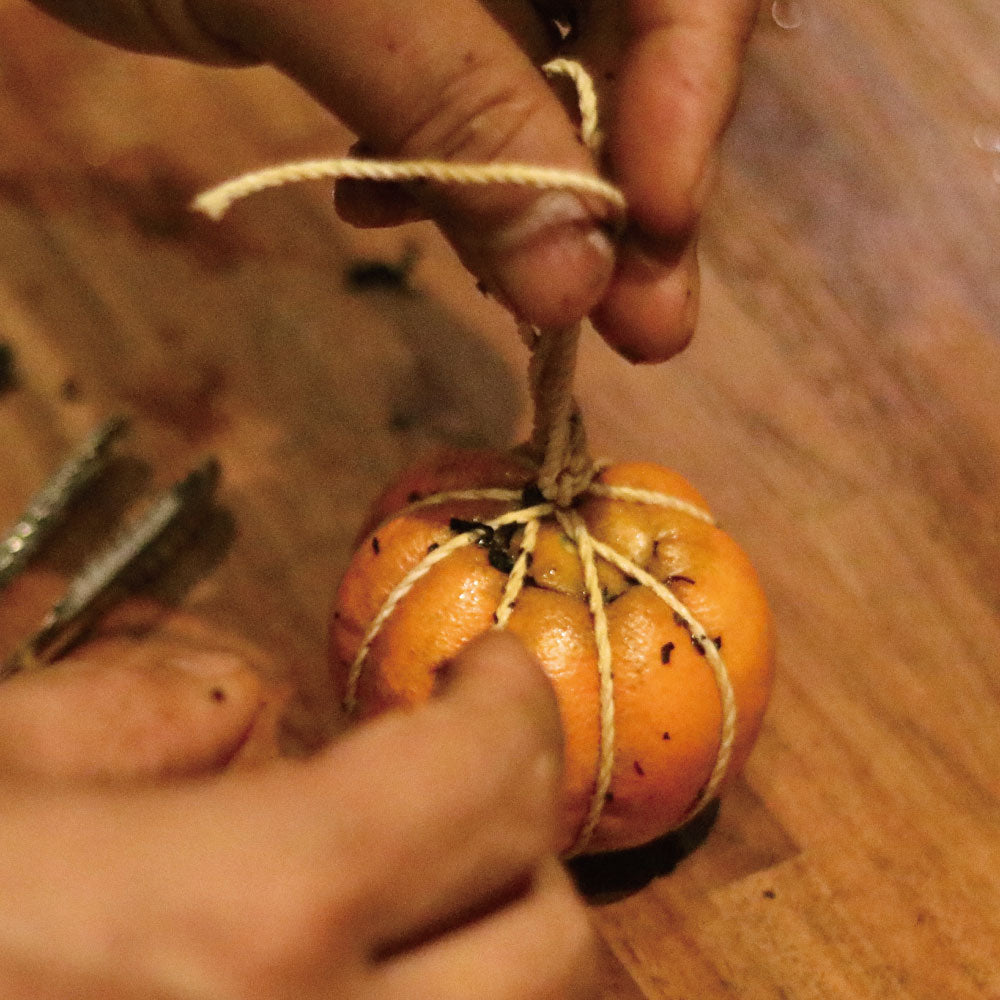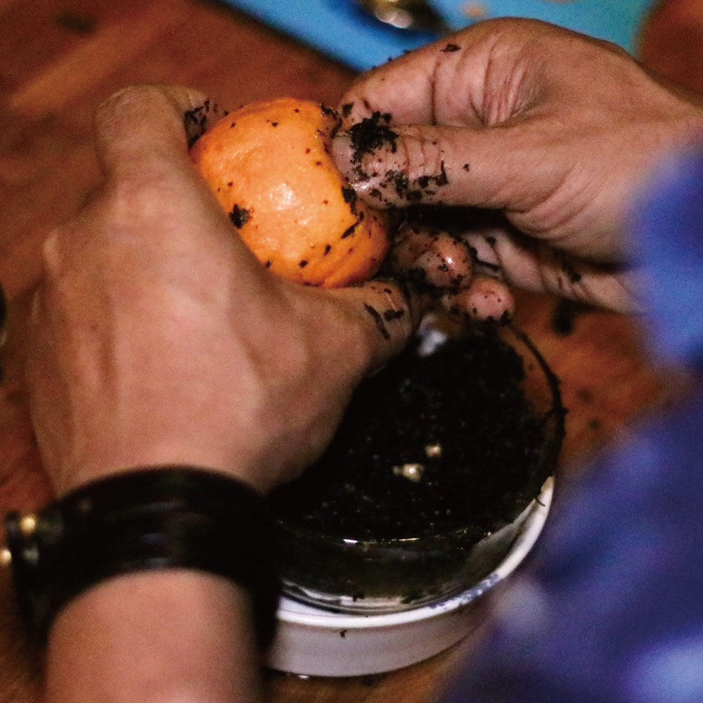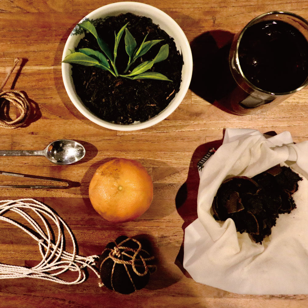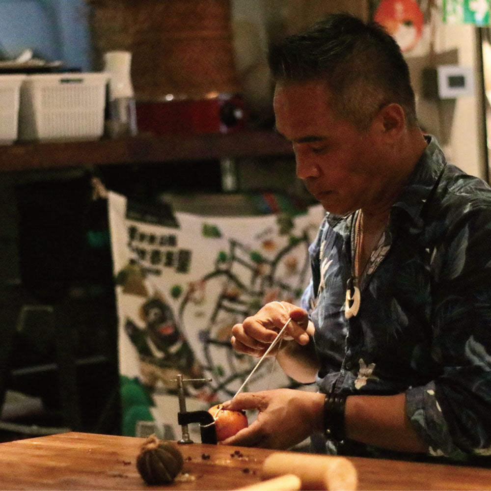 此次特製的紅江橙酸柑茶,仿效客家古法但捨去複雜的傳統藥材,僅以好友「法采有機農場」栽種的紅江橙,挖空果肉後放入有機舞鶴紅茶,再填回果肉並以繩索綑綁起。歷經多次炊蒸、乾燥、日曬,等待多月熟成,換得了馥郁、悠長、醉人的綿細柑橘茶香,有如台版的伯爵紅茶,令Warren大為讚嘆其縱古貫今的風土交融之美。而為了表現此款酸柑茶的細緻,將黑巧克力稍微降低至57%,再添加嘉義洲南鹽場的鹽之花,除了藉著海味串起與南島文化的連結,也把酸柑茶與巧克力的甜酸苦甘融為一家。