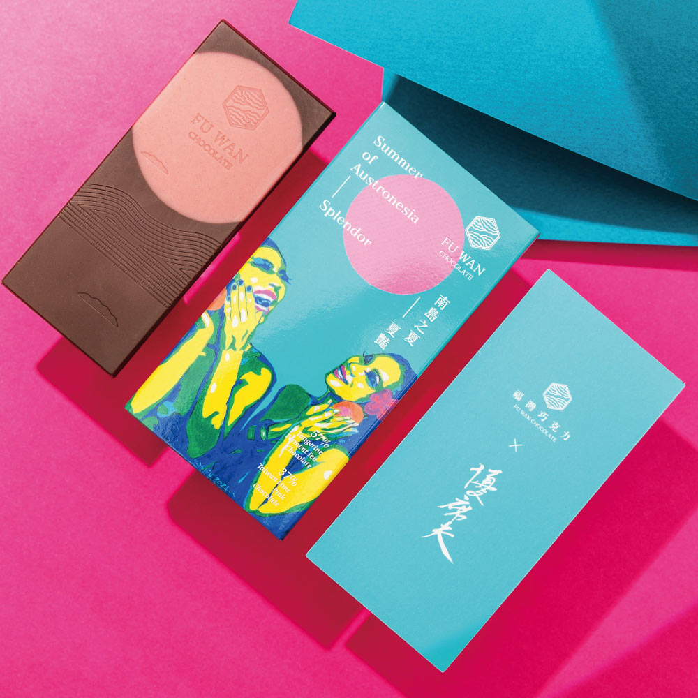 以「永續巧克力商業模式」獲得日本Good Design金賞的福灣巧克力與旅英台灣原民藝術家優席夫共同合作,以花東食材為主角、源於台灣的南島文化為概念,推出「南島四季」巧克力系列的第二個作品「南島之夏-夏艷」,將夏日的豔陽、波光、璀璨與能量,全都融合進巧克力中。