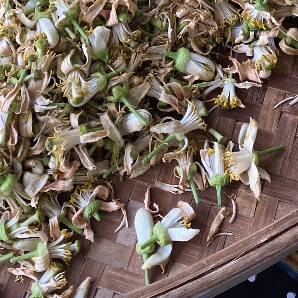 瑞穗這一帶的丘陵地,除了適合種茶、咖啡之外,文旦與柚子也是在地主要的農作物,遠近馳名。這次秋季的設計,因選擇了花蓮柚花,於是我開始思考,創作的美感與色調要如何呈現呢?腦海中就出現了每當秋收時,整個花東縱谷美麗的黃金稻浪,還有小時候記憶裡柚子花的甜美香氣,最後這件作品『好香的風』,就這樣完成了。