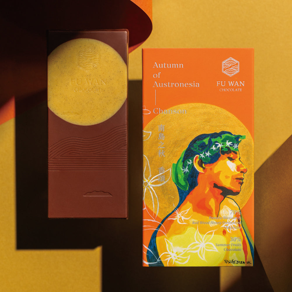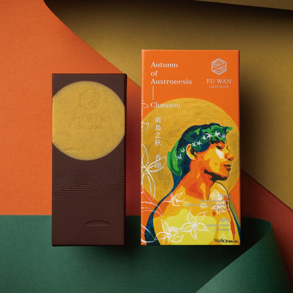 以「永續巧克力商業模式」獲得日本GoodDesign金賞的福灣巧克力與旅英台灣原民藝術家優席夫共同合作,以花東食材為主角、源於台灣的南島文化為概念,推出「南島四季」巧克力系列的第三號作品「南島之秋-香頌」,將春花、夏果、野蜜,融合秋日稻浪的燦金柔黃,結合在這片巧克力中,傳遞南島之秋豐收的喜悅、母親大地的守護。