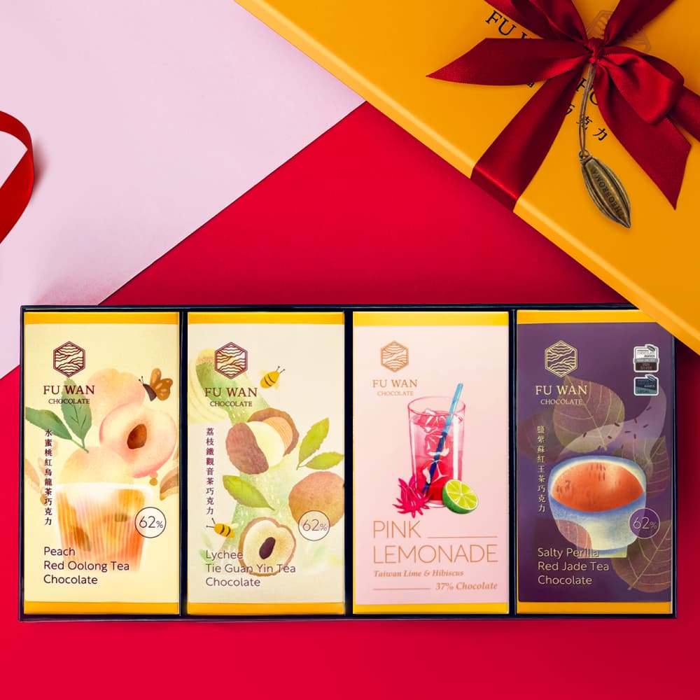 禮盒內容:四入禮盒,37% 粉紅檸檬汁巧克力-35g,62% 荔枝鐵音茶巧茶巧克力-35g,62% 鹽紫蘇紅玉茶巧克力-35g,62% 水蜜桃紅烏龍茶巧克力-35g。
