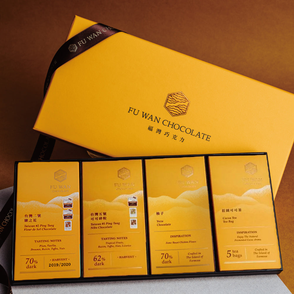 禮盒內容:四入禮盒,台灣二號鹽之花巧克力70%-45g ,台灣五號可可碎巧克力62%-45g,季節水果乾巧克力-35g,可可茶包-5入