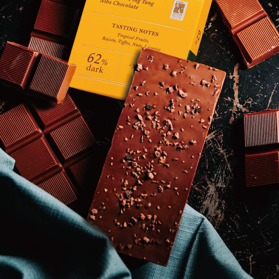 完全採用屏東在地種植可可豆,採取領先全球精品巧克力的「From Tree to Bar」作法,亦即從屏東可可鮮果在園區內進行發酵、乾燥、烘培、研磨、精煉、調溫、熟成等程序,所製成的產地原始風味巧克力,未經過抽脂程序,保留巧克力原始個性的最佳風味,最後在巧克力表面均勻撒上烘烤後的可可原豆碎粒,品嚐起來不僅口感十足,更帶有台灣個性鮮明的熱帶水果乾豐富香氣,接續下來的焦糖、堅果香氣更讓你回味無窮!