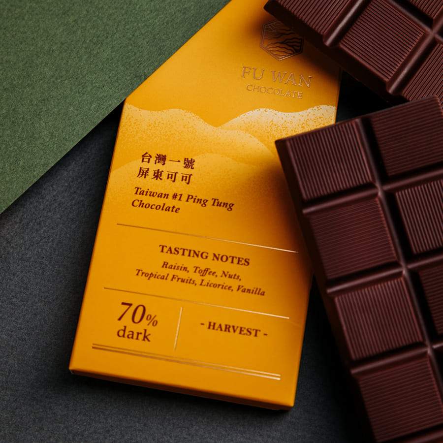 70%屏東風土黑巧克力,從可可鮮果開始發酵、烘焙、研磨等所有製程都在福灣園區內完成的TREE-TO-BAR巧克力。帶有堅果、焦糖、蘭姆酒、甘草等香氣,與些許熱帶水果酸度。