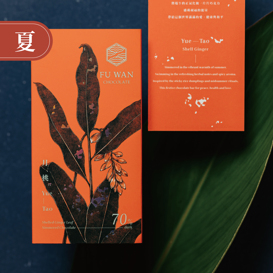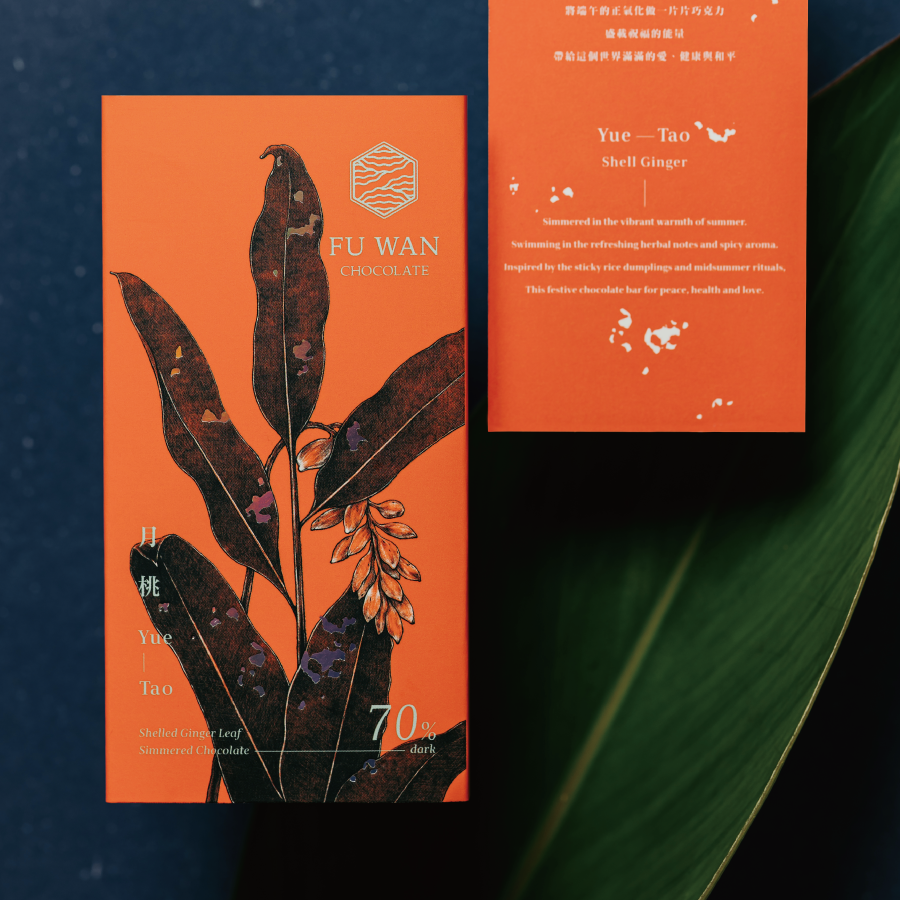 Introducing the Summer bar of FU WAN SEASON CHOCOLATE PROJECT , Yue-Tao, a 70% dark chocolate, made with the cocoa bean which is simmered in the fragranced water boiled with shell ginger leaf.