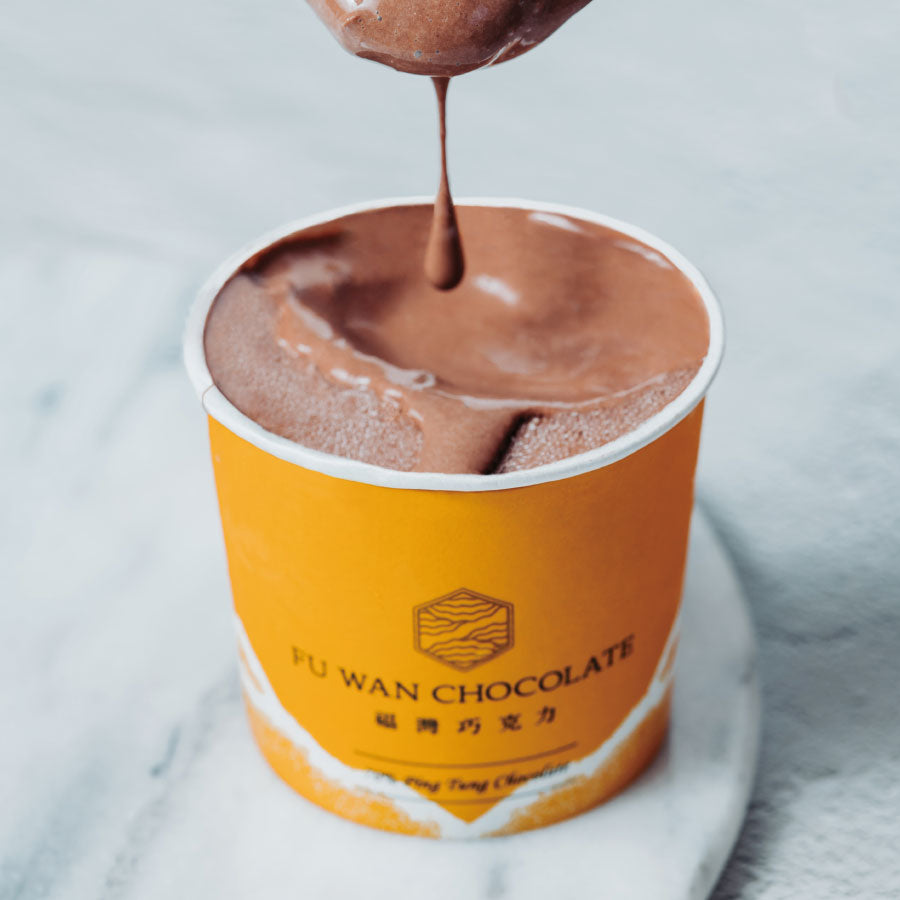 有別於坊間以可可粉製作的冰淇淋,以台灣一號70%巧克力與新鮮牛奶製作,口感綿密柔滑,帶有來自巧克力的葡萄乾、榛果、蘭姆酒等細緻的天然發酵香氣。