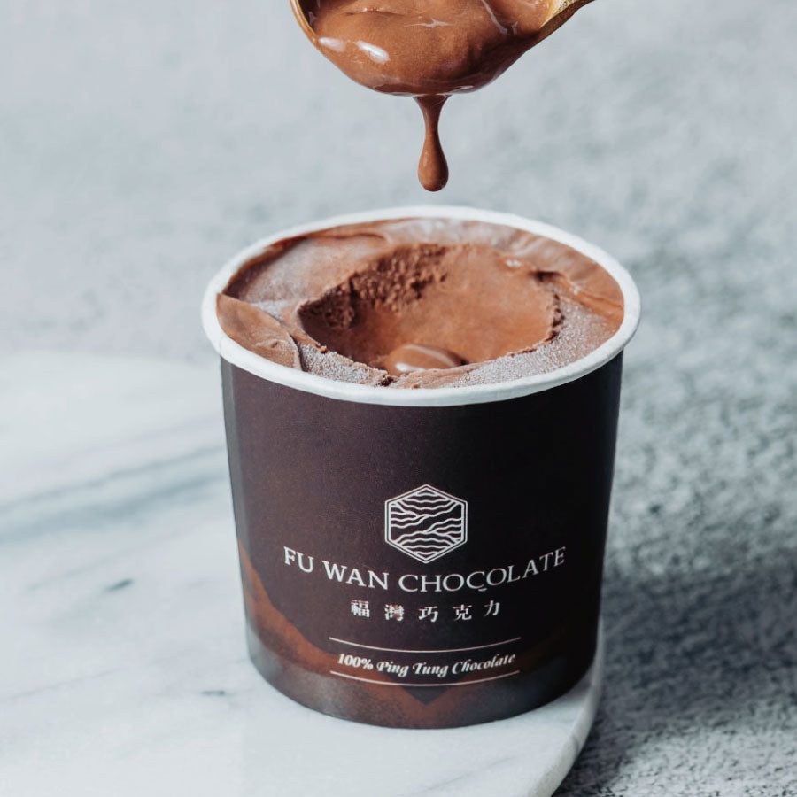 有別於坊間以可可粉製作的冰淇淋,以台灣一號巧克力與新鮮牛奶製作,口感綿密柔滑,帶有來自巧克力的葡萄乾、榛果、蘭姆酒等細緻的天然發酵香氣。